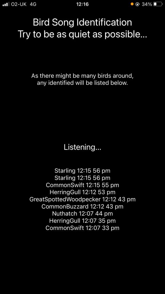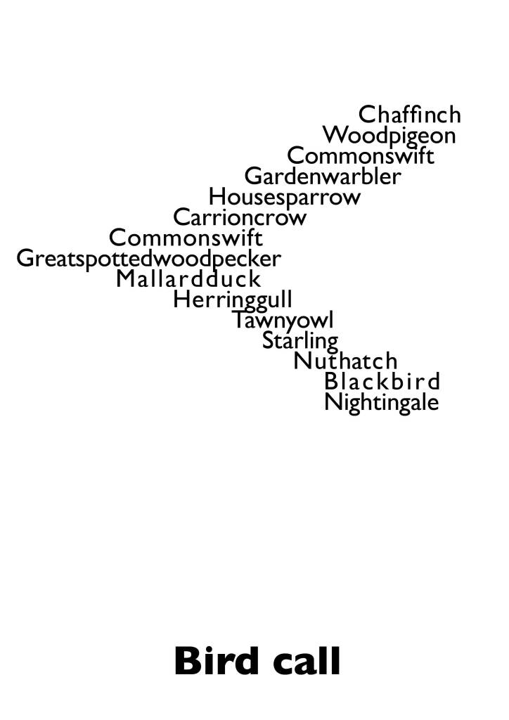 I did enjoy using the app and I managed to see a woodpecker by using the app as a notification. I would have liked to sit and just listen rather than keep walking., Although both Fulton and Long use textworks to represent their walks, I am not sure that I transferred the senses of hearing bird song onto print successfully. Also using a V shape formation probably was not the best choice as the birds I was hearing don’t fly in formations!