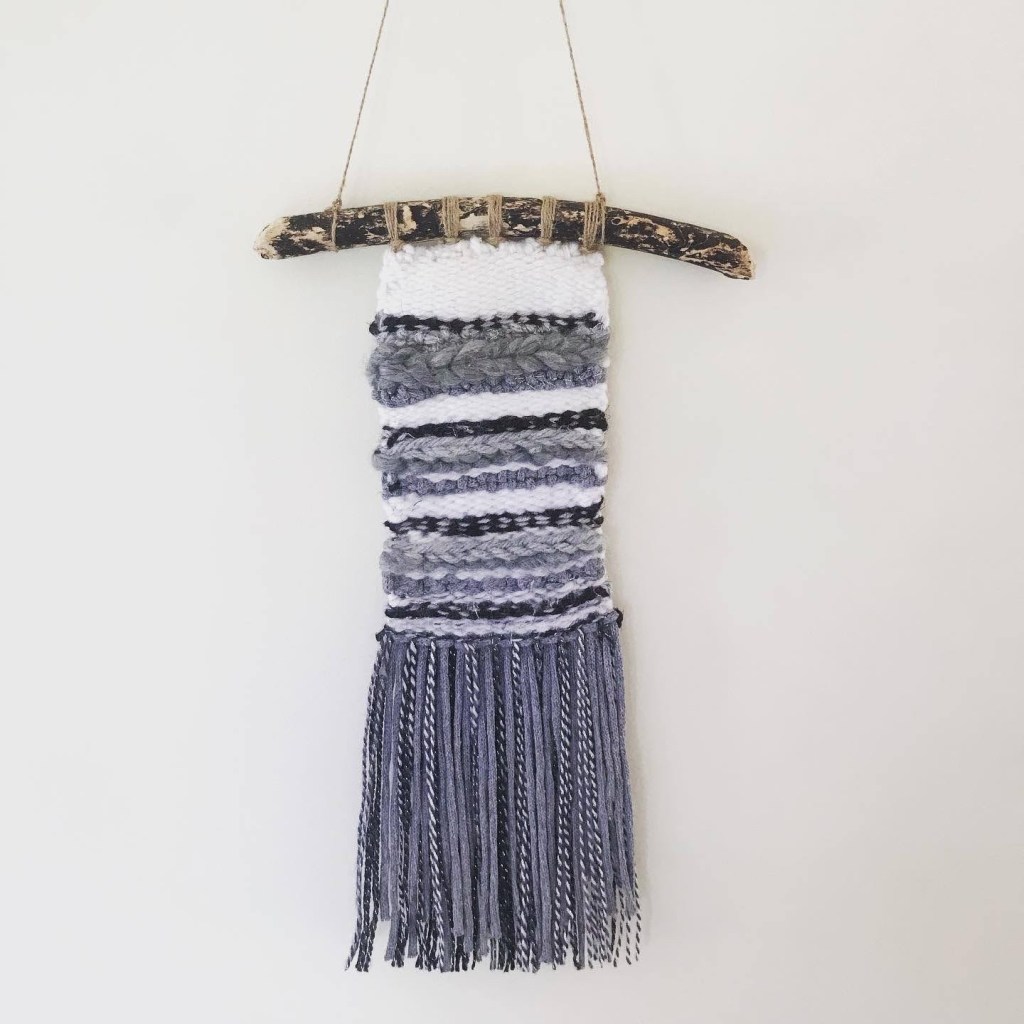 With each weave I try to introduce new weaving stitches and a variety of fibres. This one uses recycled cotton rope, merino roving and a variety of yarn weights intertwined with some silver thread. I have used hemstitch, egyptian knots, tabby weave and soumak stitches.