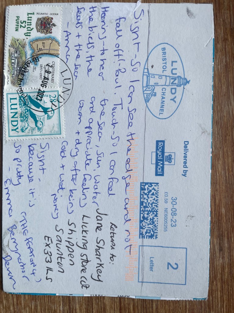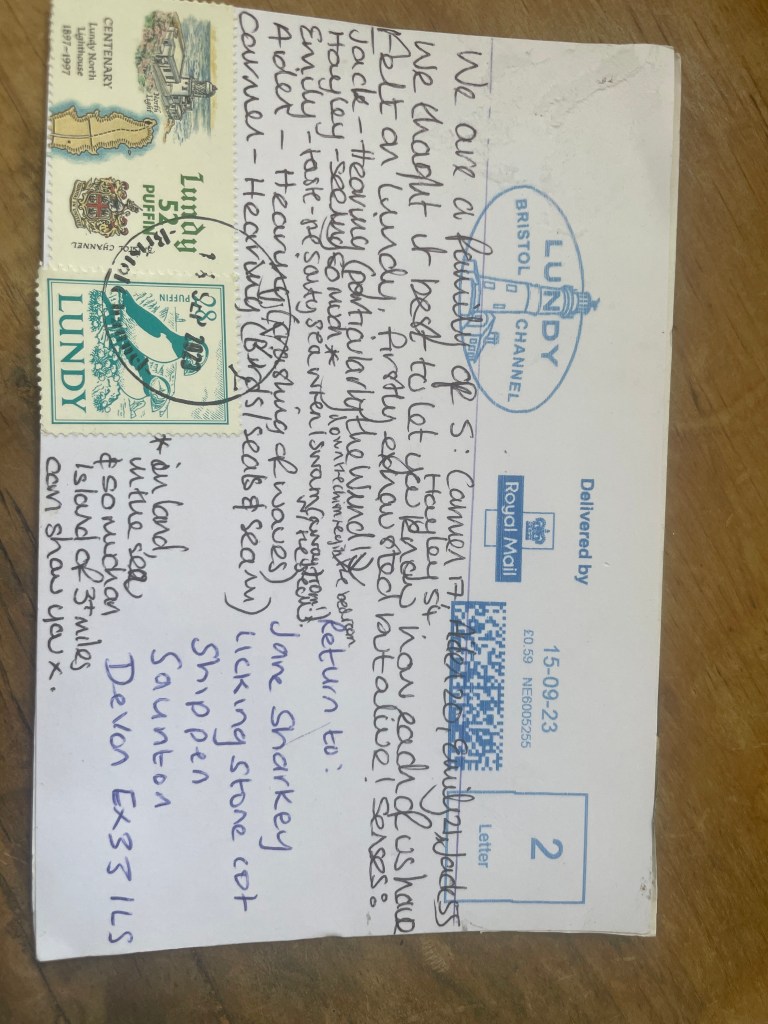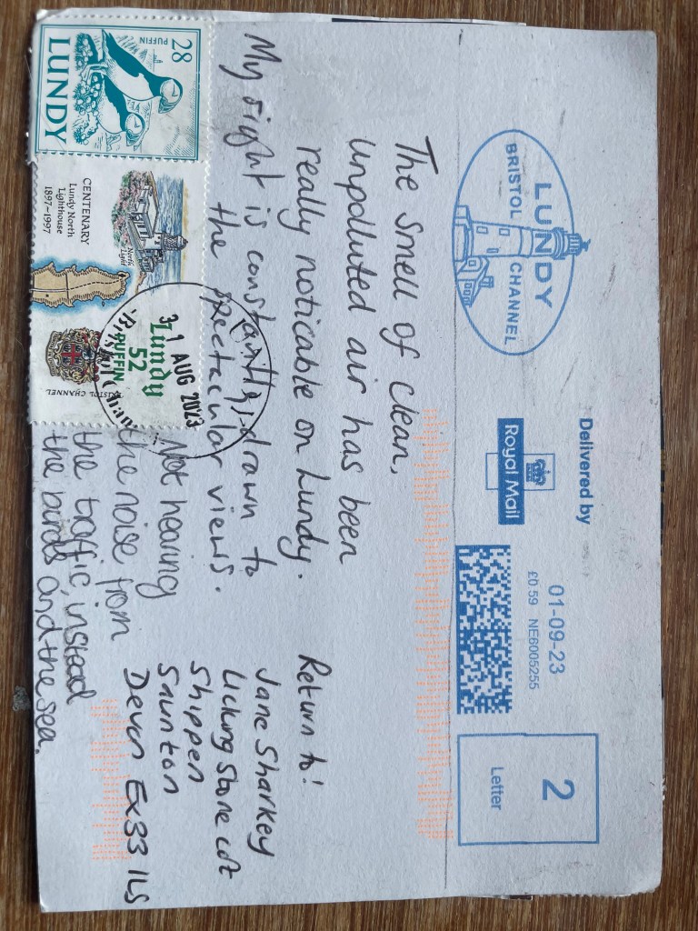 The postcards have postage stamps on them and are mailed to my mainland address. This enables the postcards to journey, from the person/people who find it, to the postmaster at Lundy, to travel via boat or helicopter, to the Royal Mail on the mainland and the Post delivery person, who puts it through my door.