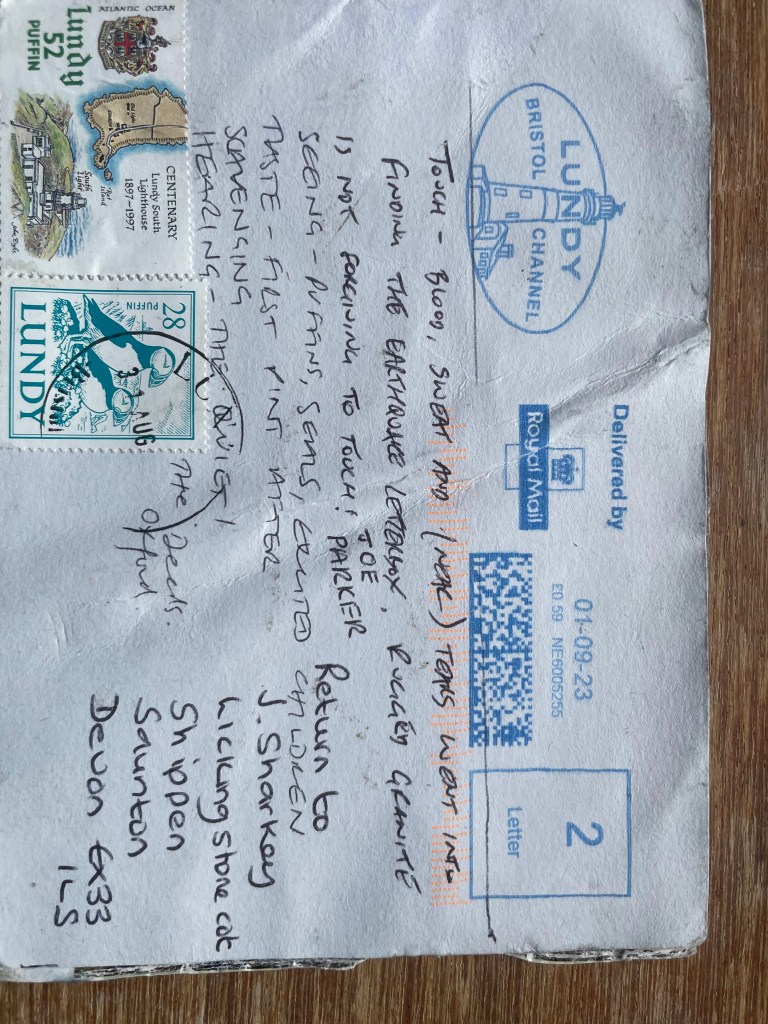My initial idea for this project came from Mail Art, a practice of sending art postcards as a way of artists exhibiting or selling work without going through a gallery. This art movement gathered momentum in the 1960’s, the most famous artists being Ray Johnson. Johnson posted collages and prints, which led to the New York Correspondence School. As a method of communicating with people, I have used the Lundy Letterboxing network and the unique Lundy Postal System; the oldest private postal system in the world, set up in 1929 by the island’s owner Martin Coles Harman.