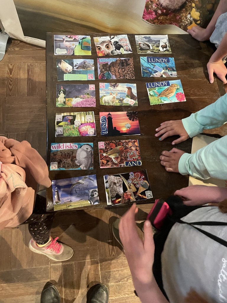 I led a workshop in the St Helens Centre on the Island, when visitors were able to make their own postcards to mail to mainland recipients. In addition a workshop with Georgeham School when pupils on Island residential produced postcards, which they then put in letter boxes and which were returned to them via their school. In the second workshop I tried to encourage participants to move away from the traditional Lundy Postcard to a more abstracted approach, which I believe worked.