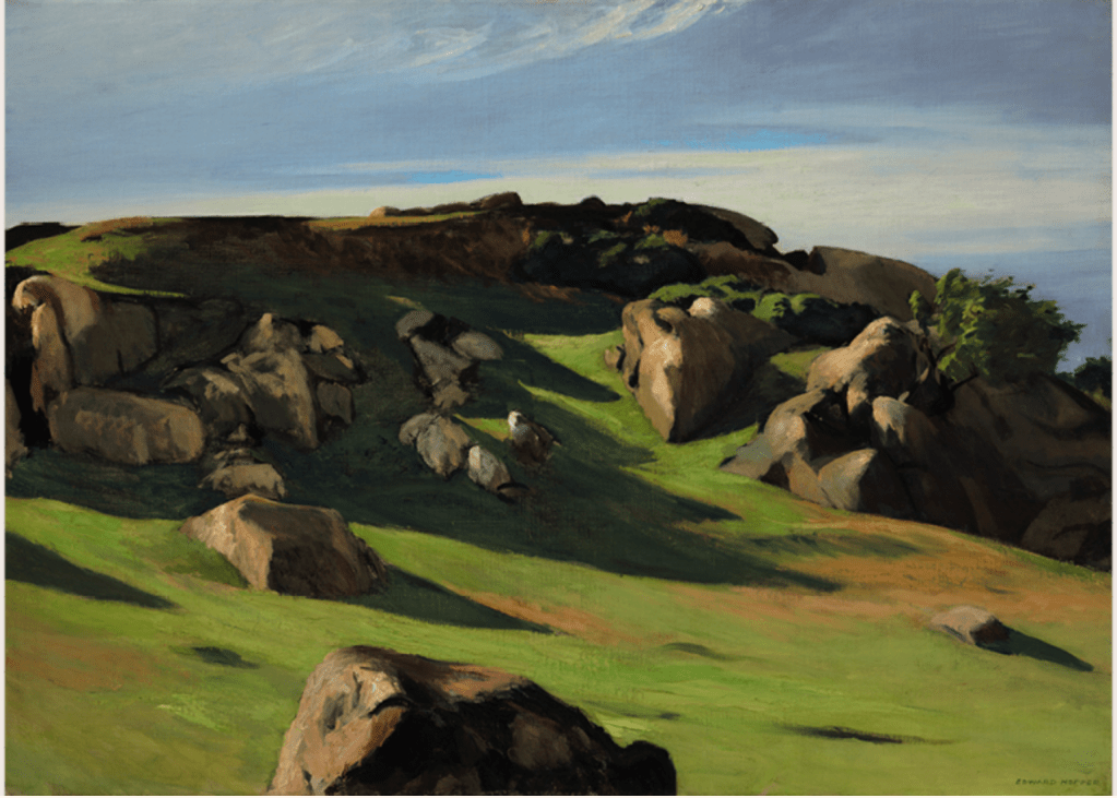 This week I was looking through past study notes and came across notes, from a lecture about working in isolation, by Stephanie Owens, Art University Plymouth. This was a lecture, in response to being at art school at the start of a pandemic. It was suggested that we might look at artists who were drawn to empty landscapes, Edward Hopper being one such artist. As soon as i saw the painting Cape Ann Granite (1928), I could see the similarities with Lundy, The painting is described by Hatfull,(2020)