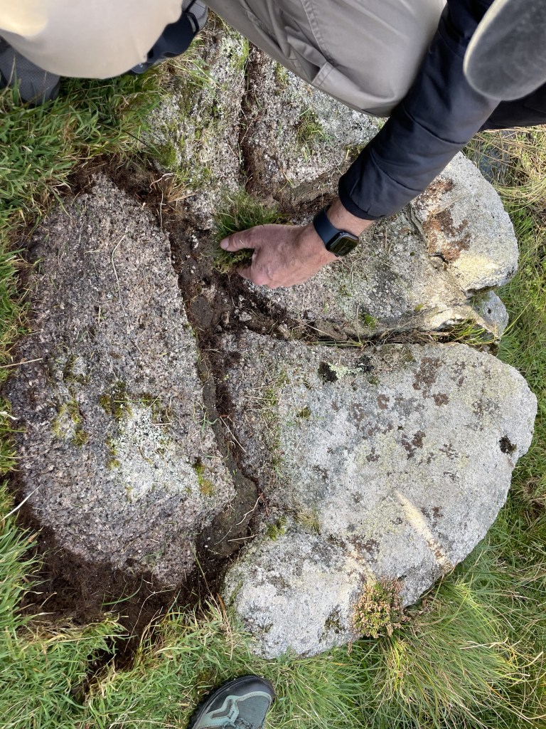 As we moved away a bit of turf which covered the bowl, we could fully see the shape and segments, some of us touched the granite, others decided to draw a sketch. We all stayed for a while considering its use and location. We might have had different ideas of its purpose but we all agreed on the interest of the bowl.