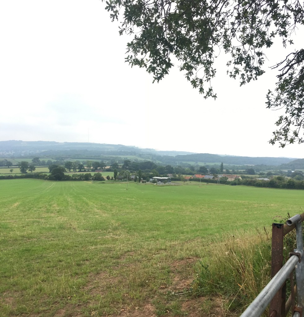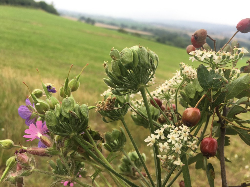 The tall corn fields lead on to Apple Orchards field upon field of Apple orchards. Obviously we are deep in Somerset Cider country! We are soon rewarded with views of the Somerset countryside and lush English hedgerows of blackthorn, hawthorn and rambling flowers. After being enclosed by fields of maize and apples the views are now breathtaking. Views out to the Mendip ridge can be seen from here.