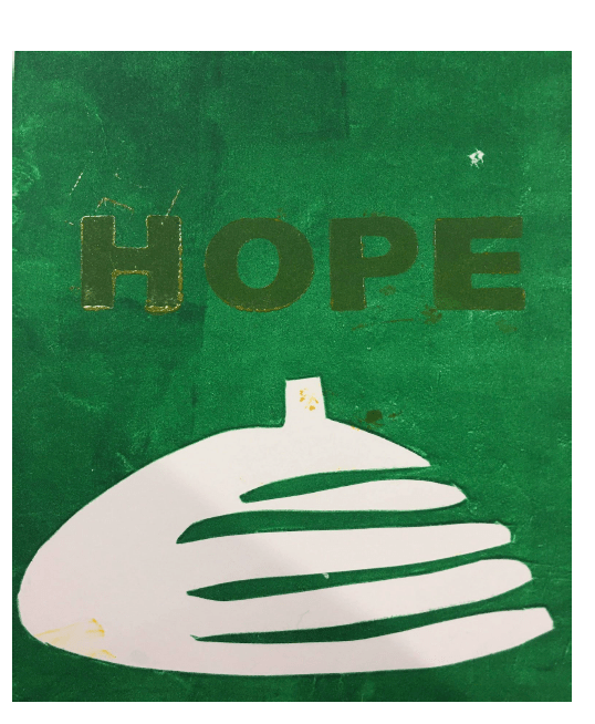 I did not have access to a studio as we were still in lock-down. So I adopted simple monoprinting techniques. in this first print I used the image of the path up to the Tor. The path offers a less direct but easier journey to the top of the Tor. I used the words HOPE in large letters as this was a very used word during the COVID pandemic.
