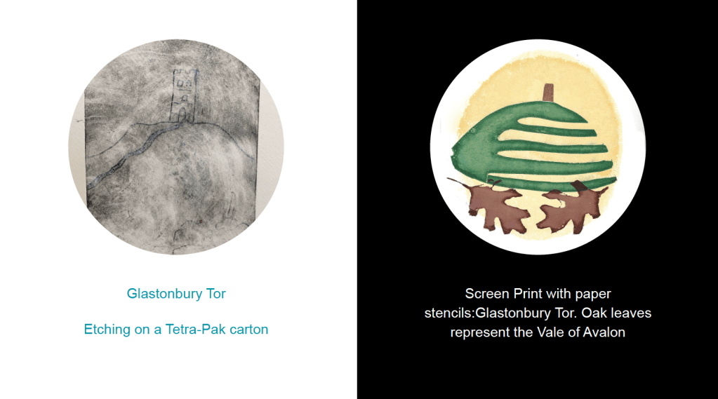 I then decided to use screen printing and test out my new print screen. I linked this with the great oaks of Avalon that we came across on the journey. I also tried etching on a tetra pack, another simple method to use whilst in lock down. This created a more atmospheric delicate Glastonbury Tor.