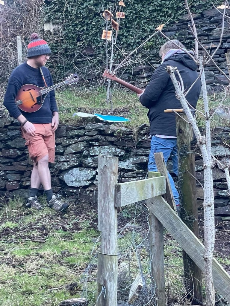 Once the three apple trees had been blessed, the formal part of the wassail gently dissolved into music and merriment. The Lundy Head Chef (Teresa) and the Lundy Warden (Simon) filled the allotment with music. This lively “hullabaloo.” contributed to the blessing of the orchard which encourages fertility of the fruit.